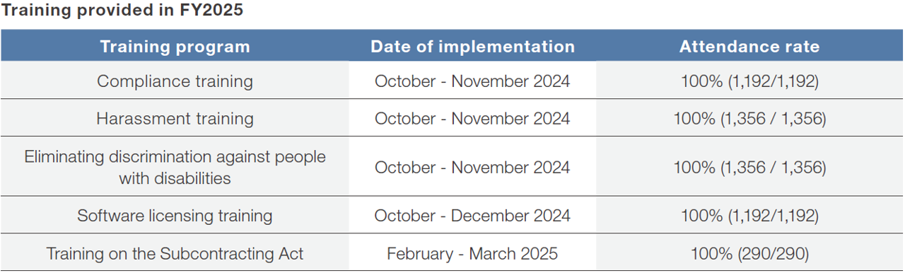 In FY2025, we conducted harassment training and compliance training for employees at our head office and Group companies in Japan. As an individual compliance theme, we conducted training on the Subcontracting Act (formally, the Act against Delay in Payment of Subcontract Proceeds, etc. to Subcontractors), to enable employees involved in subcontracting transactions to deepen their understanding of the various obligations and prohibitions that are required in practice.