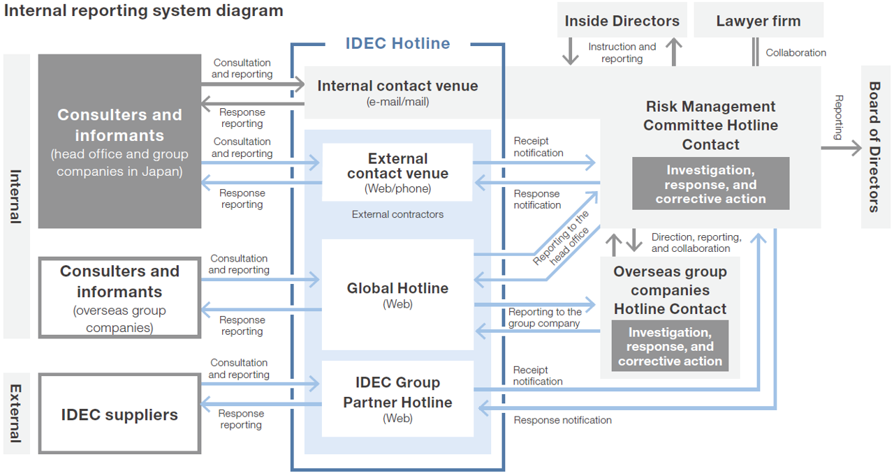 The IDEC Hotline has been established as a contact venue that allows users to select external and internal contact and anonymously or with real names in accordance with the users’ situation. We have established internal reporting and operation rules to protect the confidentiality of consultation and reporting, and to prohibit unfavorable treatment of users. When a report is made, the Hotline Contact established within the Risk Management Committee promptly responds to the report, and works at resolving the problem and preventing recurrence. The report is also promptly communicated to the top management, and regularly reported to the Board of Directors to share risk information. In cases where management may be involved, a system exists to ensure independence and to liaise with an external law firm.