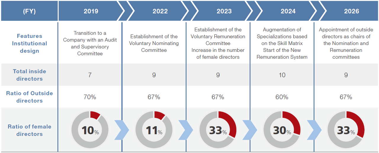 We have ensured that outside directors constitute the majority of all directors since FY2017. The Board of Directors is a diverse body made up of men and women with different backgrounds and areas of expertise.