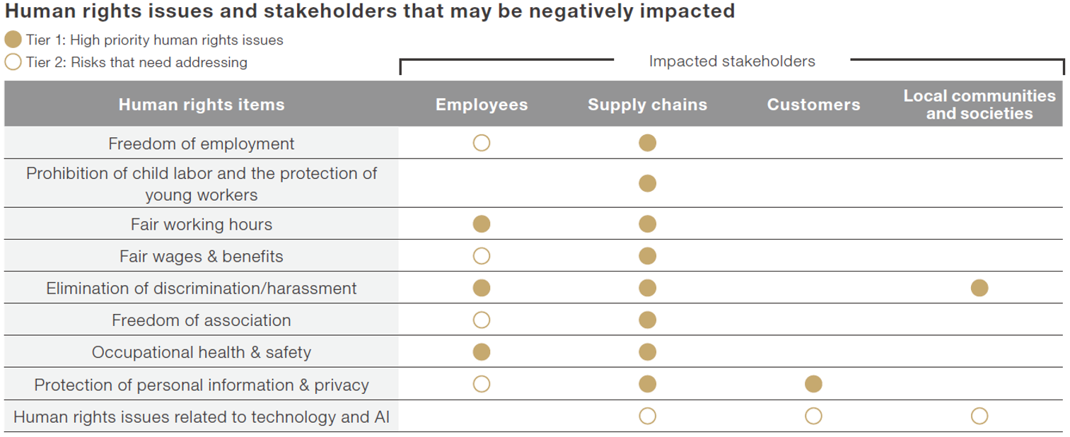The Risk Management Committee’s “Human Rights Subcommittee” has identified and assessed potential negative impacts on human rights within our value chain that could be caused by the IDEC Group’s business decisions and operations. Human rights items below are based on “Human rights items significant to the IDEC Group” in the IDEC Human Rights Statement. Going forward, we will formulate policies that outlines the implementation of preventive and corrective measures to address these high priority human rights issues.