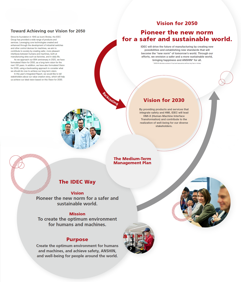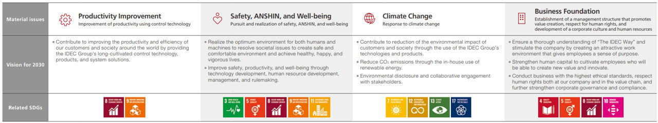 Along with formulating its long-term vision for 2050 and interim vision for 2030 in 2023, IDEC reviewed material issues, incorporating enhancement of its human capital and governance under the heading “business foundation”. IDEC again reviewed some of its material issues in light of the external environment and other factors and, in addition to adding respect for human rights in 2024, also changed its interim vision for 2030.